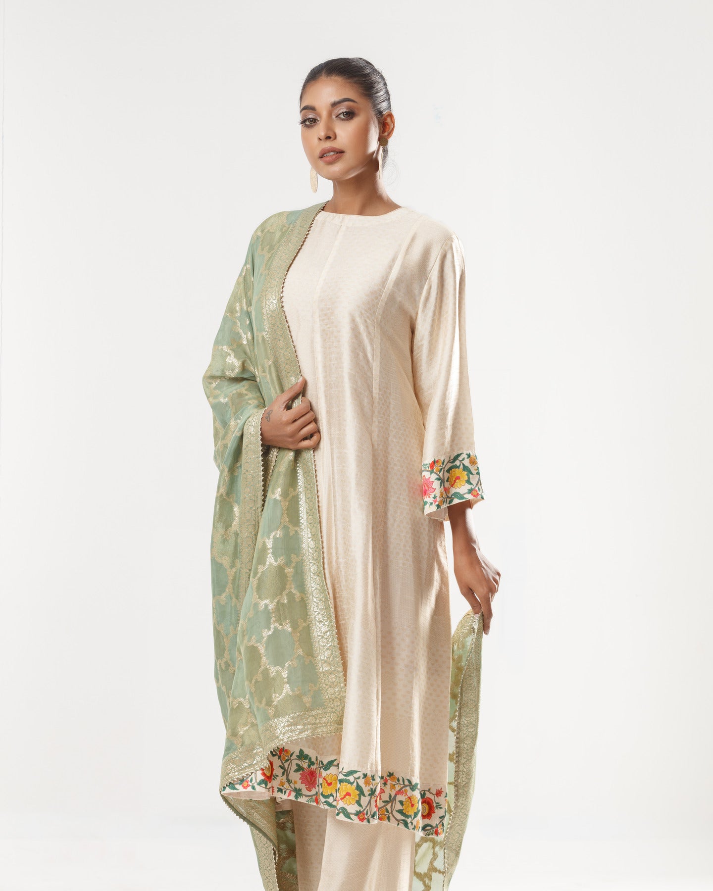 Look 18: Arnira wears a beige anarkali set adorned with floral lacework, complemented by a contrasting sage green brocade dupatta with elegant zari borders.