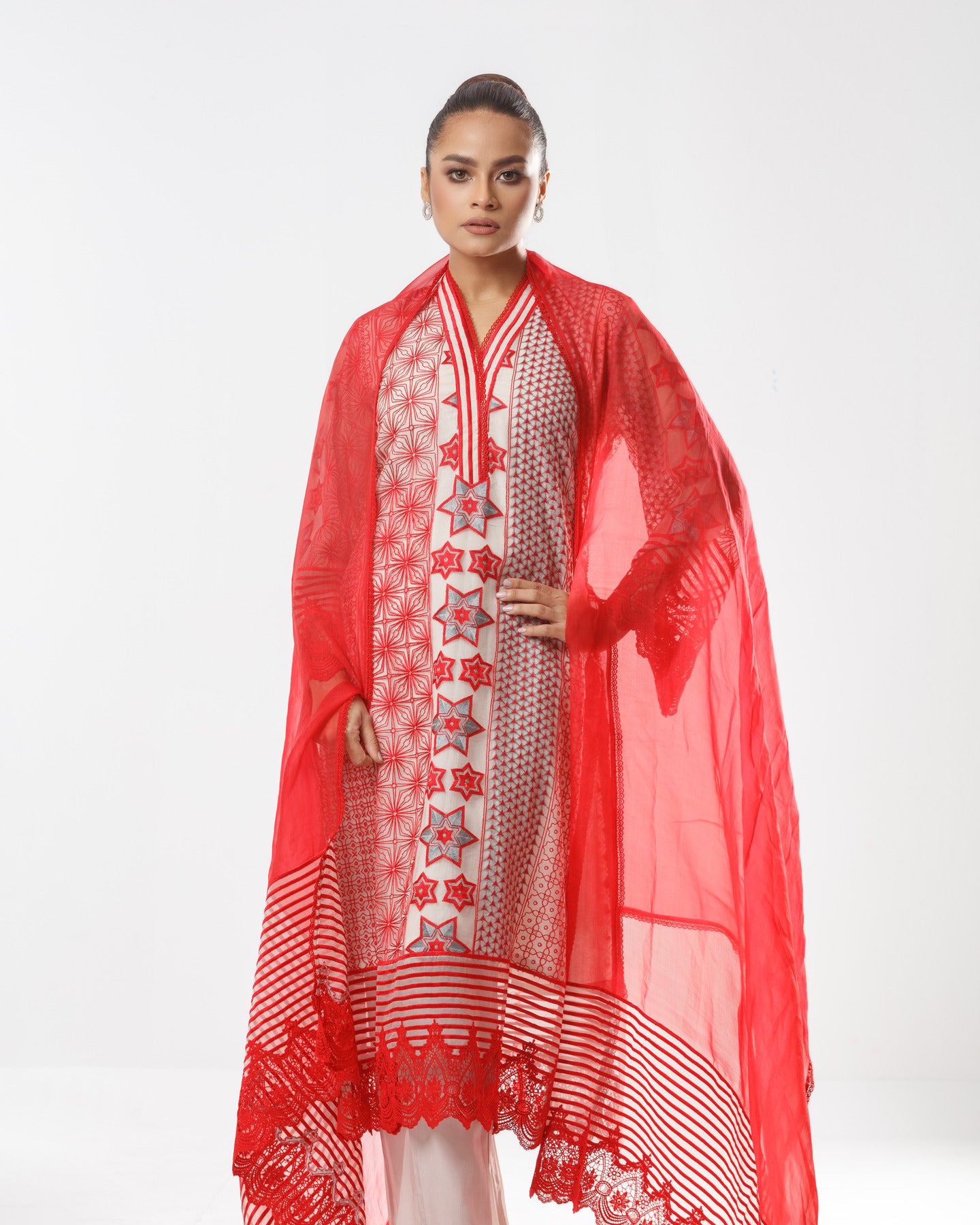 Look 19 : Mashiat wears a white salwar kameez set with extensive embroidery, ribbon work & lacework, paired with a contrasting red muslin dupatta.