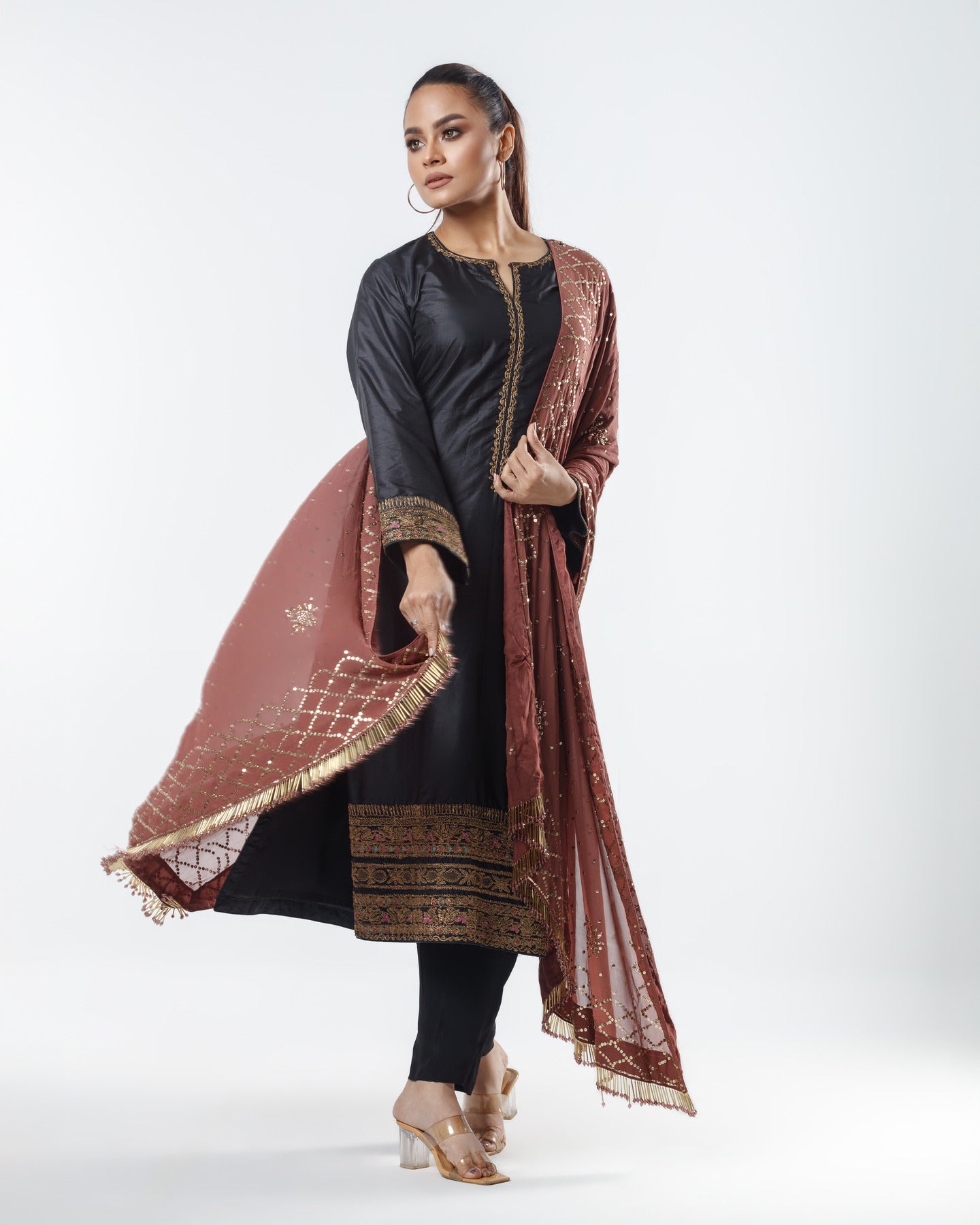 Look 4 :Mashiat wears a black salwar kameez set featuring delicate embroidery, paired with a contrasting maroon dupatta adorned with extensive sequin work and jewel tassels.